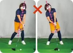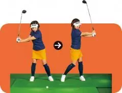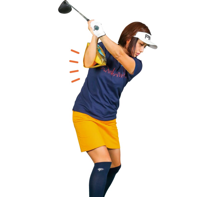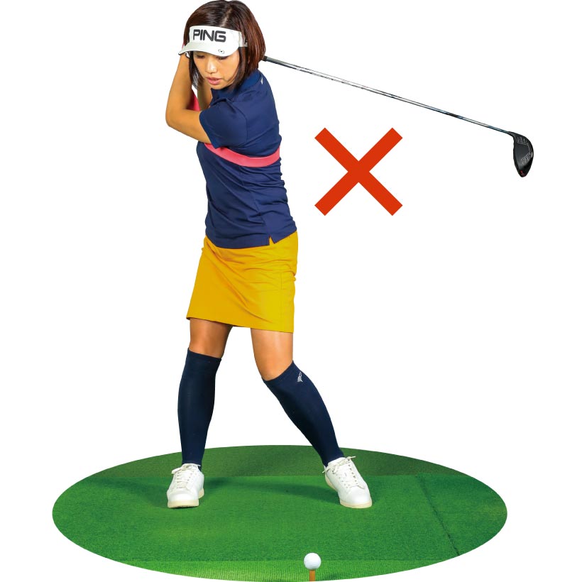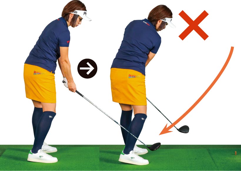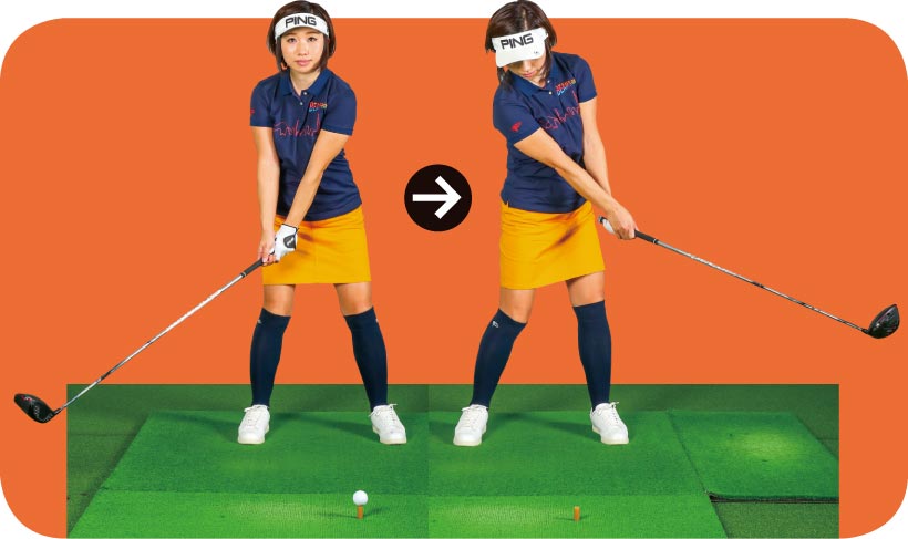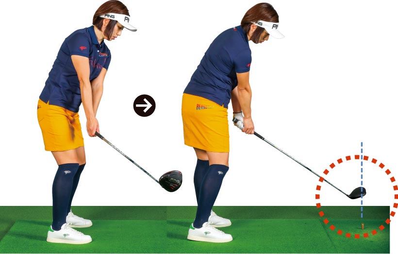 大事なのは当たったあと目標方向より右にヘッドを出すこと。イメージ的にはティの真上の延長上にヘッドがくる感じです。小さく振れば誰でもできますから、そこで感覚をつかんでから大きく振りましょう。