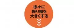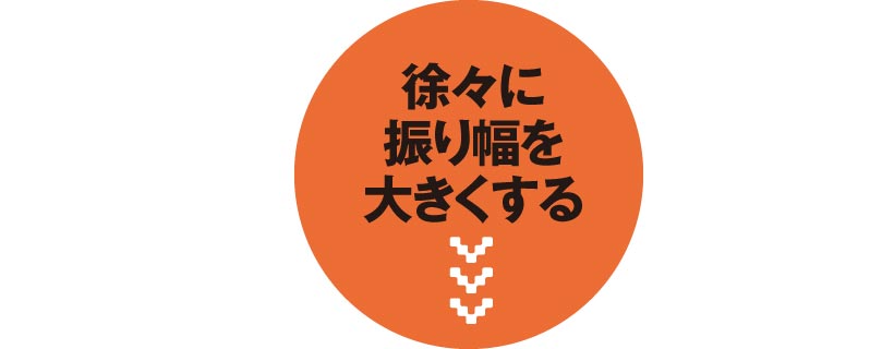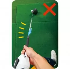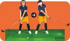 まずはヘッドがバックスイングで8時、フォローで4時の振り幅からはじめ、コックが入る腰から腰くらいの振り幅まで徐々に大きくしていきます。フェース面が正しく動くとミートできて意外と飛びます。