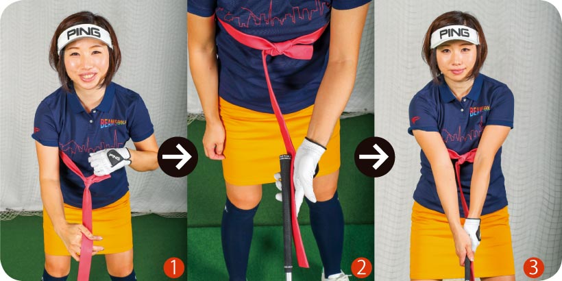 100円均一ショップにあるものでもいいので普通のゴムチューブを用意してください。右の要領で、みぞおちあたりからチューブが出るようにして体に巻き、クラブとチューブを一緒にグリップします。