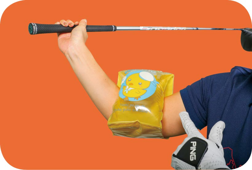 この状態で正しくスイングを始動するとチューブが伸びるので、バックスイングでもゆるまないように動いてください。手先でヒョイとクラブを上げるとチューブはたるんだまま。手と体の距離が近くなるので必ず伸ばすこと。チューブを伸ばしたままで動けると、スイングアークが安定してミート率が上がります。ほとんどの人は肩が回らず、回ったとしてもクラブを上げきれません。目標はトップでもチューブを伸ばしたままにすることです。