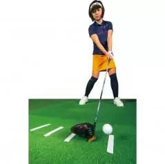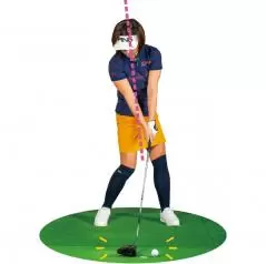 開いたフェースが閉じながらボールに向かい、インパクトでスクエアになるのが正しいフェース面の動き。これを再現できるよう、マットにフェース向きを示すテープを貼ります。できればボールの左右30センチくらいの範囲で貼ってください。