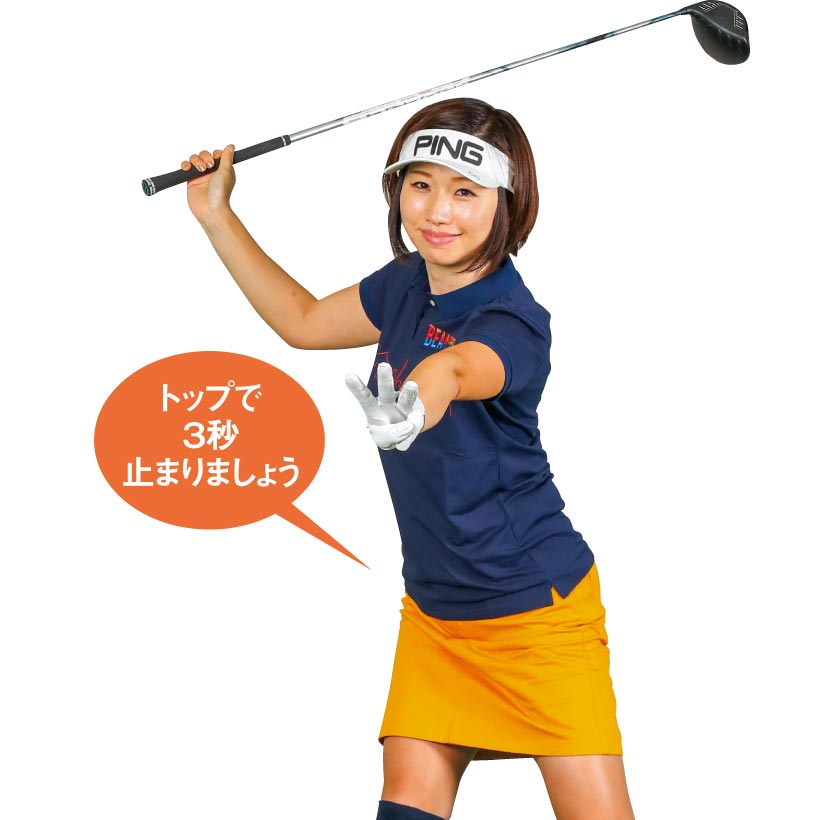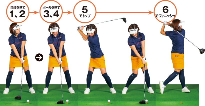 オススメは6カウントでフィニッシュまで振ること。構えてからカウントするとうまくいかないので、目標を見て「1、2」、ボールを見て「3、4」、「5」でトップに上げて「6」で振り抜きます。「静」から「動」の部分を流れに組み込むことでスムーズに始動できます。