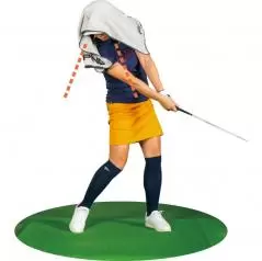 頭からタオルをかぶってスイングします。こうすると視界が遮られて正面方向しか見えません。その状態のままインパクトできれば大きなミスヒットにはなりません。視界が確保できていればうまく当たるというわけです。ボールに集中できてヘッドアップを抑える効果もあります。アドレスとインパクトで若干景色が変わるので、その違いを感じてください。