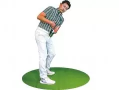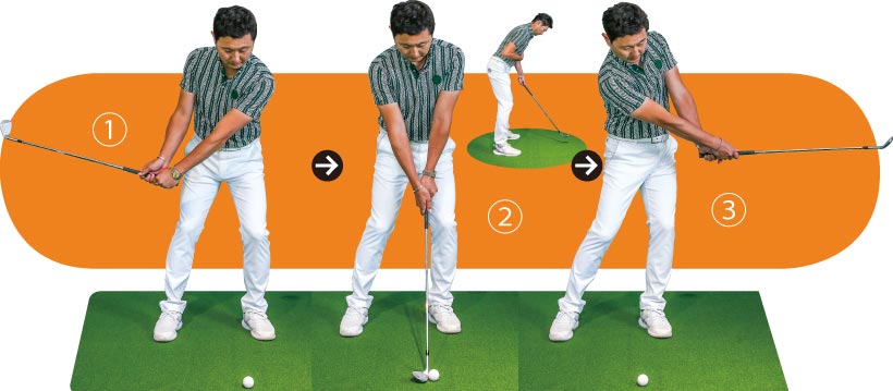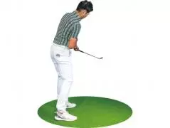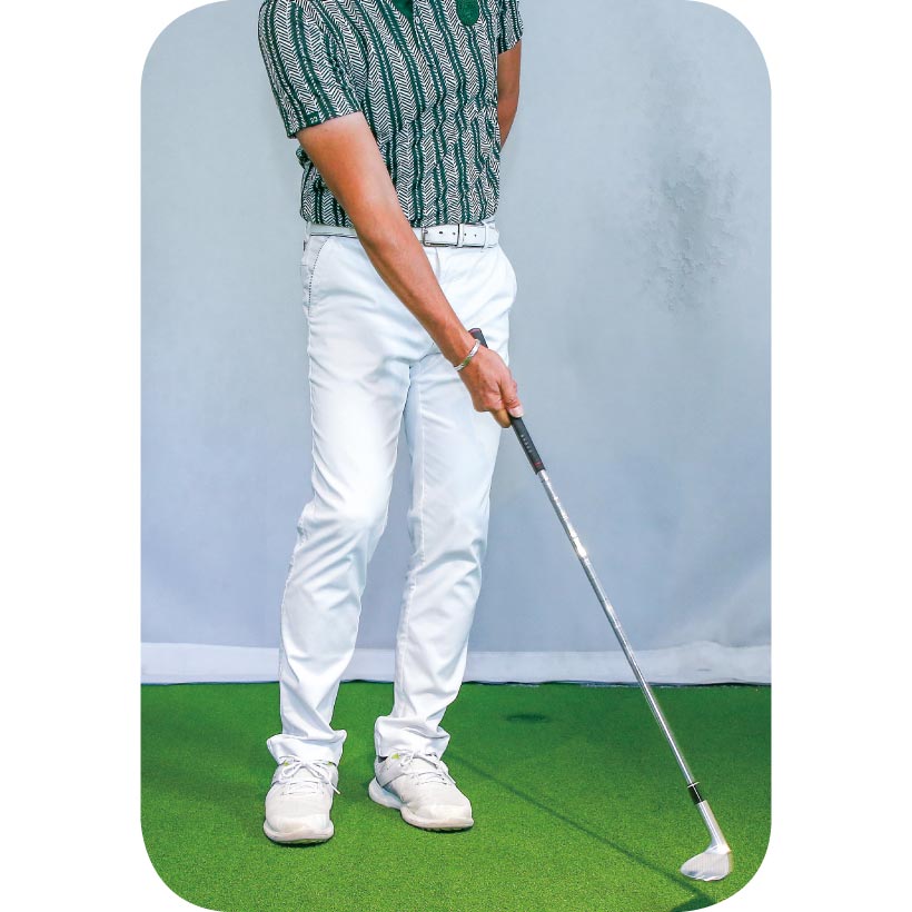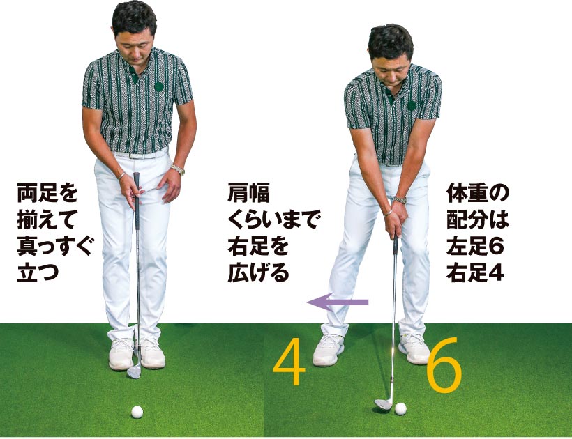両足を揃えた姿勢からスイングの大きさに合わせて右足を広げ、スタンス幅を調整して構えたらあとは手首を使わずにスイングしましょう。