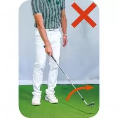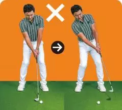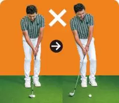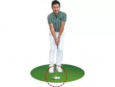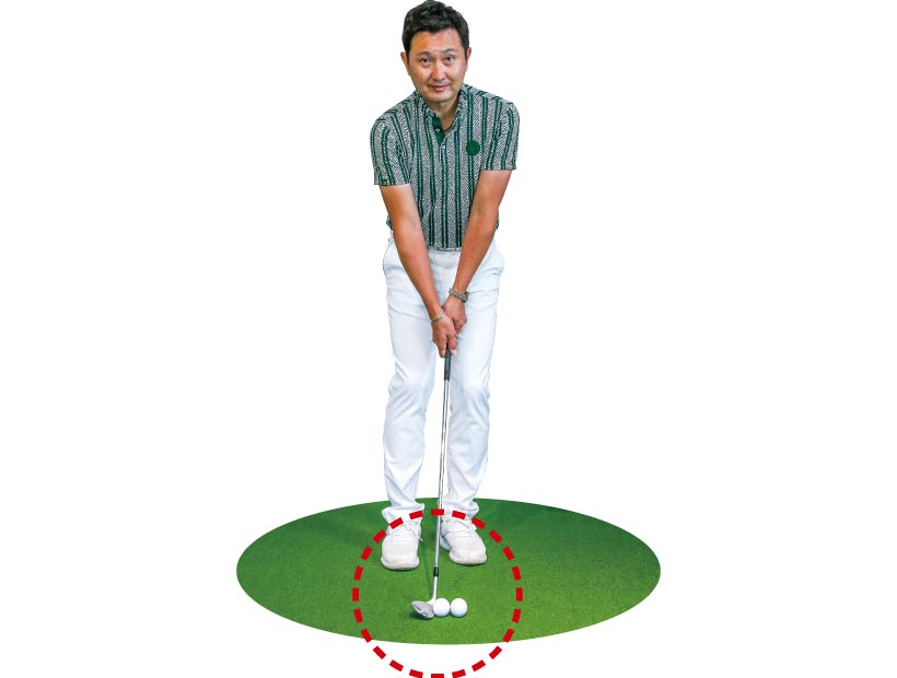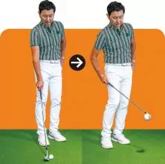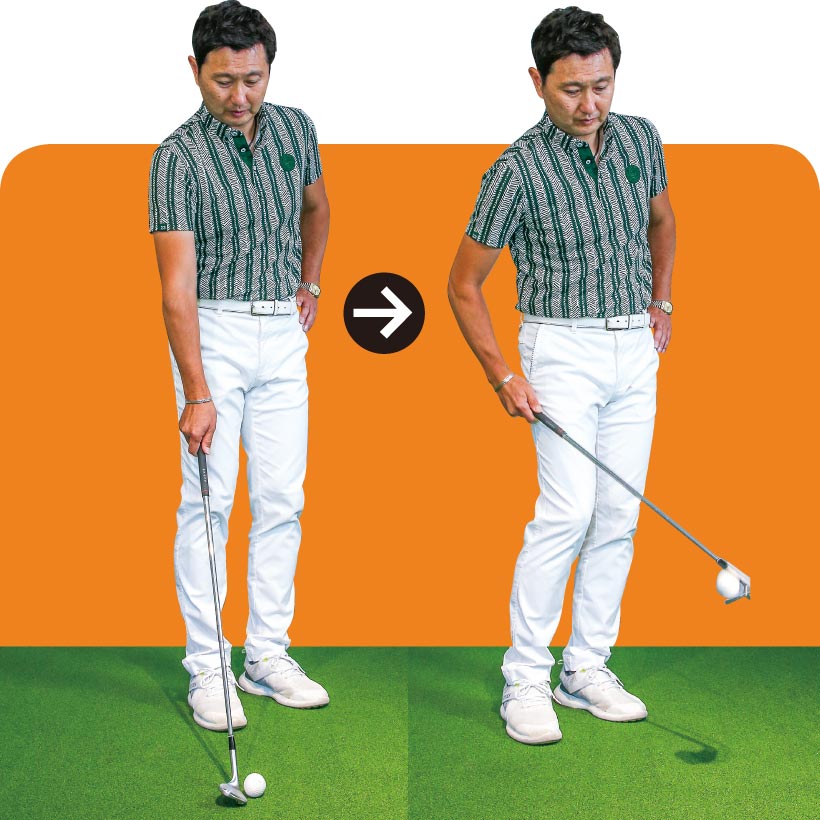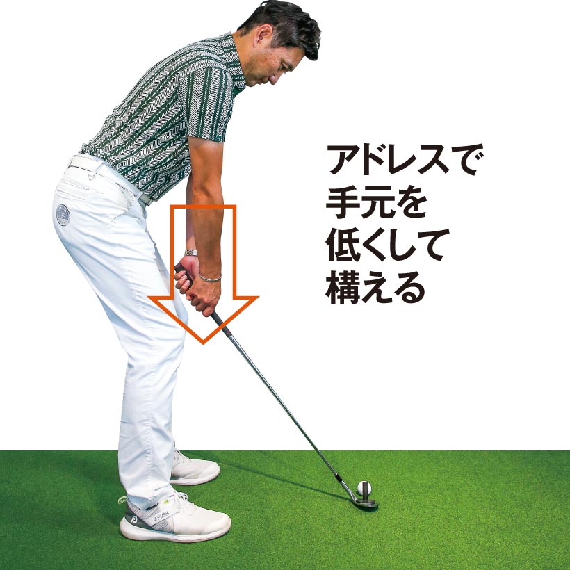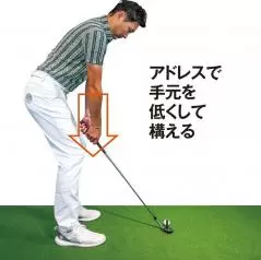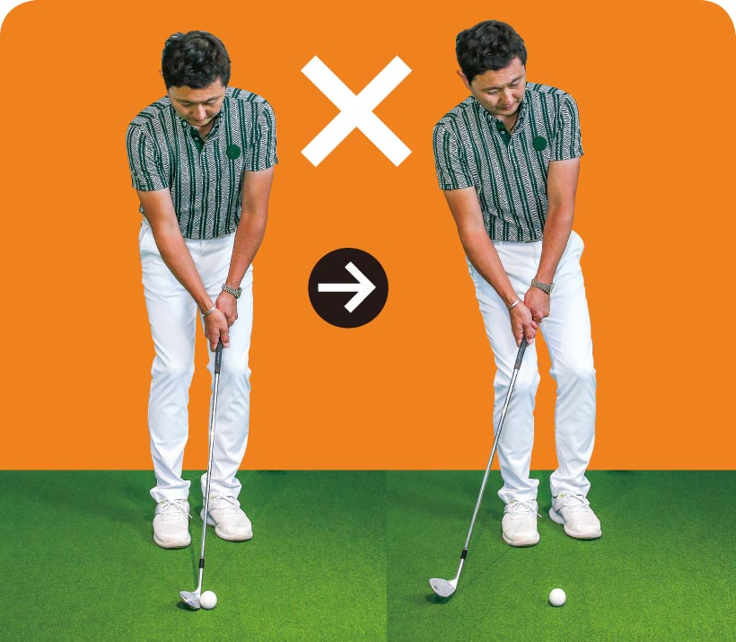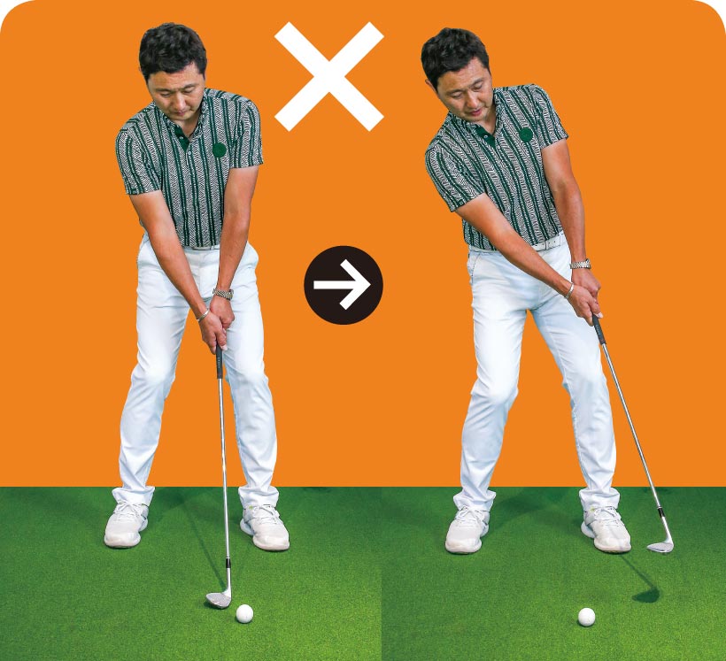 低く転がしたければスタンスを狭くし、ボールを右足の前に置いてハンドファーストに構えますが、上げたいときはボールを左足寄りに置き、両手を体の中心線上にセットします。上げたいのにハンドファーストに構え、打つときにしゃくり上げてしまう人がとても多く、それがダフリなどのミスを招く要因になります。