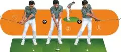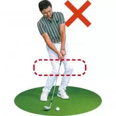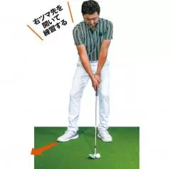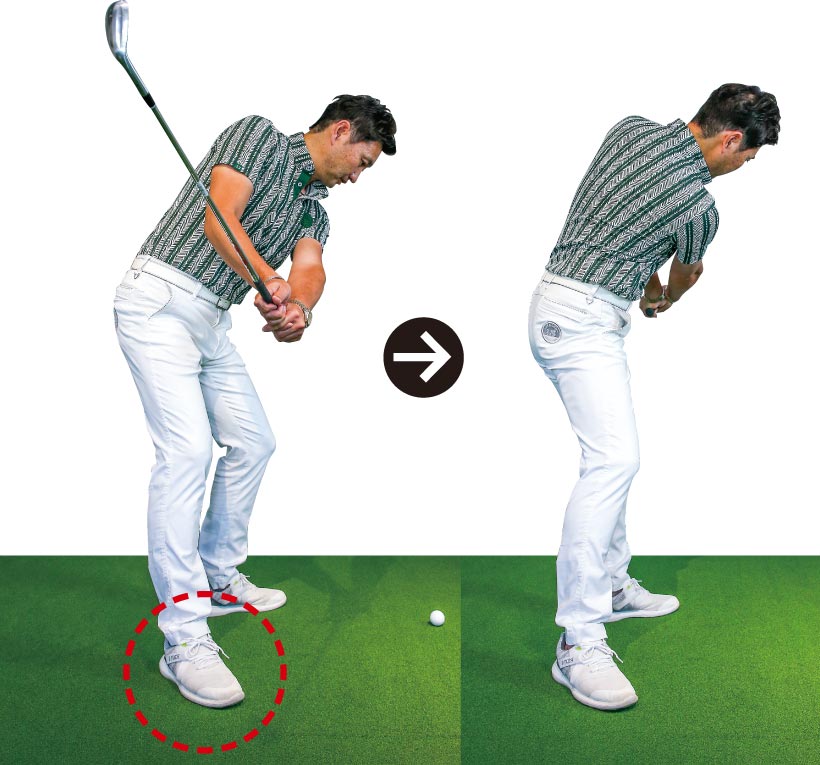 ダウンスイングでヒザが流れやすい人にオススメのドリルです。とくにインパクトで右ヒザが前に出るとフェースが大きく開き、ボールがネックに当たればシャンクが生じます。これが癖になると厄介ですから右足のツマ先を開いて構え、右足を動かさないでボールを打つ練習で早めに修正しておきましょう。
