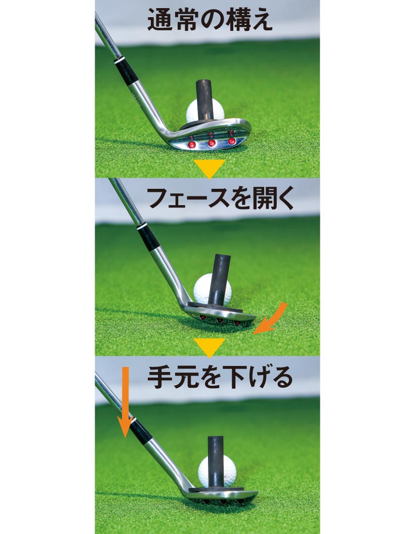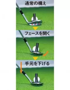 クラブヘッドをボールの下に通してソールを滑らせる感覚を養う練習です。まずSWのフェースを開いてソールの面を広く使えるようにしますが、そのままではフェースがやや右を向くのでボールが右に飛んでしまいます。そこでフェースが目標を向くまで手元を下げてハンドダウンに構えるのがコツです。