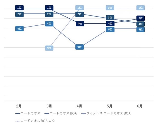発売当初、一見して、その独創的デザインに抵抗を感じる人もいたのでは?という考えもよぎったのだが、二木ゴルフ・多摩センター店でシューズ売り場を担当する小林義久さんによれば「そんなことは、一切ありませんでしたね。逆に先進的なデザインを珍しがったり、かっこいいとおっしゃる方ばかりでした。そして、みなさんが履いた途端に『これはいいね』と気に入られたご様子でした」という。その小林さんの言葉を証明するかのように「コードカオス」シリーズは、発売と同時に売れ筋の上位を席巻し始めた。そして、2月の発売から7月まで、コードカオスがコードカオス BOAと交代しただけで、半年連続で「コードカオス」シリーズが1位を守り続けている。以下は、YPS(矢野経済研究所)の販売実績データだ。