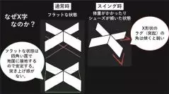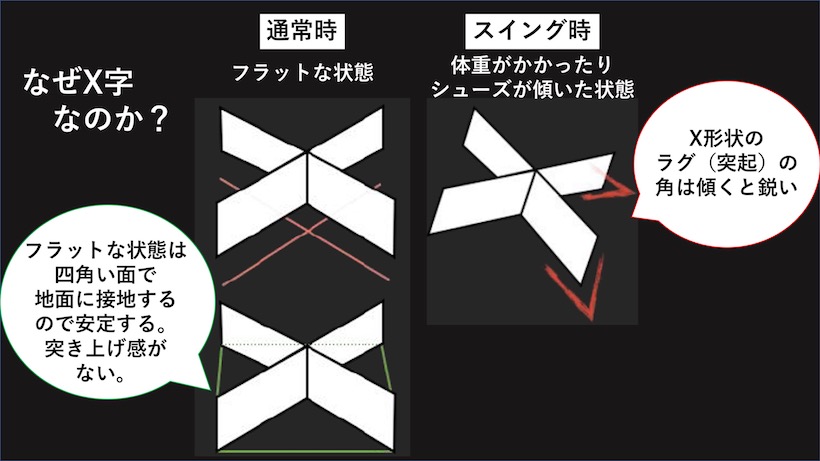 次に、このX字状のラグはフラットな状態では四角く地面をとらえている。だが、スイング中には足裏のある一点に体重・圧がかかるときがある。その際、X字状のラグの各先端部分が地面に刺さる形となって、グリップ力を生むようになっているのだ。そのグリップ力は、一点にかかる圧が強ければ強いほど高くなる。よって、体重移動を大きく活用するダイナミックなフットワークに対して、スパイクのように地面にラグが刺さることで、より強いグリップ力が発揮されるということだ。