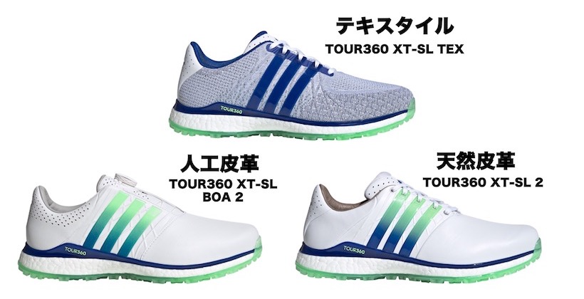 人それぞれ、スイングによって求めるクラブの性能やフィーリングが違うように、シューズに求めるフィーリングやグリップ力につながるフットワークの使い方も違う。最先端テクノロジーによる恩恵にはあずかりたいが、皮の見た目、履き心地も忘れたくない。そんなニーズに応えてか、「TOUR360 XT-SL」シリーズには、アッパー素材の違う3つのモデルがラインアップされている。
