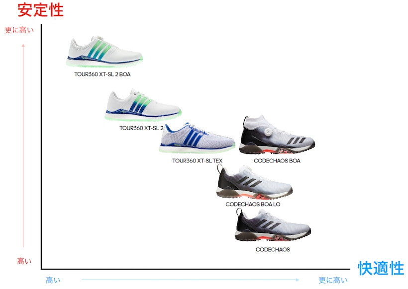 下の図は、「TOUR360 XT-SL」シリーズと「コードカオス」シリーズの安定性(グリップ力)と快適性の違いをわかりやすく表したものだ。購入の際の参考にしてほしい。