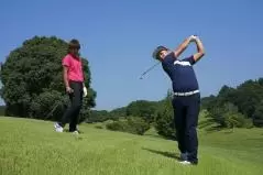 では、さっそくティショット。ドライバーによる300ヤードスイングで試してもらおう。ふたりには、普段通りのスイングを心がけてもらった。