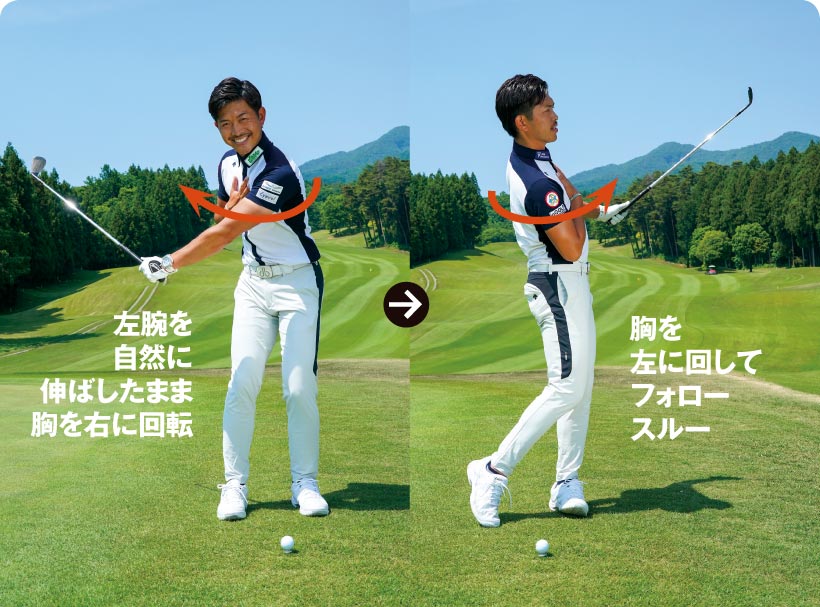 体打ちは手首を極力使わず、体の回転だけでスイングします。フェース面にボールが吸い付いている時間が長く、低く出てキュキュッと止まる球が打てます。
