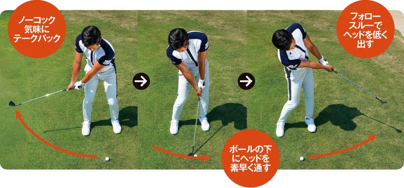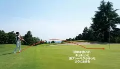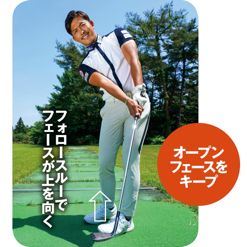 トップを怖がらずにしっかり振れば、ボールにきれいなスピンをかけることができます。上から打ち込むとフェースの刃が芝に刺さりやすいので避けましょう。