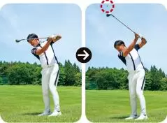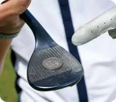 スピンをかけるアプローチはフェースを軽く開いて構え、フェースを開いたままフォロースルーまで振るのが基本です。そこでフェース面にコインを乗せて、コインを落とさないように振れるかをチェック。テークバックやインパクトで手首をこねたり、フォロースルーでフェースを返したりするとコインがすぐに落ちてしまいます。