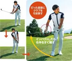 バウンスを滑らせて振り抜くアプローチとは違い、ヘッドを走らせてインパクトし、瞬間的にスピンをかけたら右手を離してクラブを素早く引き戻します。