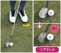 上が通常時、下が低く打ち出したい時のフェースの閉じ具合。ちょっとフェースを立てるくらいでいい。左足のツマ先を少し開くと、フォローが出しやすい形になる。