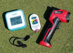 UVインデックスを測るUVチェッカー、物体の表面温度を測る赤外線温度計、気温を測る一般的な温度計を使用。