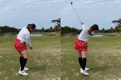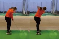これはカカトを最後までつけて打つ練習なのですが、ご覧のとおり、上の練習場では最後までしっかりカカトをつけたまま打てるのに、コースに出ると体が開くのが早くなって、足も上がってしまうんです。このような練習場とコースの溝を埋めるべく、日々頑張っています!!