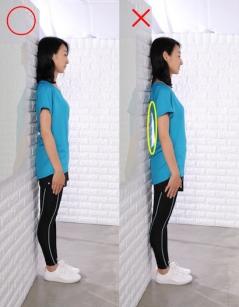 1.壁に背中を向け、肩甲骨とお尻がつく程度の位置にいつも通りの姿勢で立つ。この時、壁に寄りかかってはダメ。