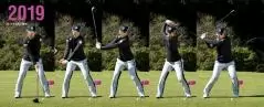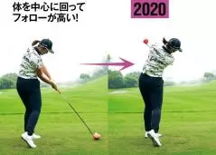 最も良くなったのはアドレスです。今年は左肩が少し上がって、頭がわずかに右側にあるのでアドレスからフェードを打つ雰囲気が出ています。トップも昨年とは違いますね。今年はアウトサイドに上げるから、腕が伸びて高いトップになっています。昨年はインサイドに上げるから、腕が曲がってヘッドが垂れています。垂れたヘッドを強引に戻すのでバランスが悪くなっていました。今年はインパクト前後でも頭が残ったまま体が回転しているので、本来のパワーフェードが打てるようになったと思います。