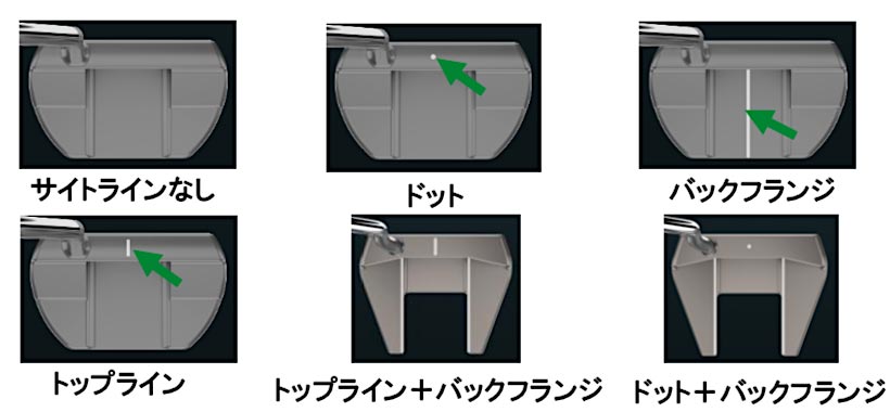 ヘッド上面のアライメントも、カスタムが可能となっています。サイトラインをまったく入れないスタイルはもちろん、ドット、トップライン、バックフランジ、トップライン+バックフランジ(LAS VEGASのみ)、ドット+バックフランジ(LAS VEGASのみ)と、計6つのパターンが用意されているので、ゴルファーそれぞれにもっとも構えやすいアライメントのパターへと仕上げることができる。