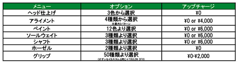 オデッセイのハイエンドシリーズ、オデッセイTOULONパターを好みの仕様にできる「TOULON GARAGE パター」では、オデッセイロゴなど、多くの部分のカラーを12色から選択可能。またラインナップされた4つのヘッドには、それぞれ2種類のホーゼルが用意され、ヘッド仕上げも通常製品にはない3種類が用意されている。さらに、ヘッド上面のアラメントは最大6パターンから選択可能。もちろん、シャフトやグリップも、複数のタイプから選ぶことができる。