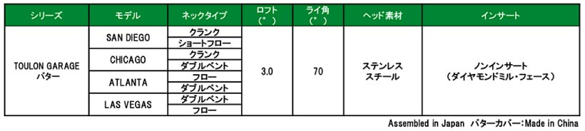 ヘッドラインナップには、ブレードタイプのSAN DIEGO、CHICAGO、マレットタイプのATLANTA、ツノ型のLAS VEGASが用意されている。また、各モデルいずれも、2種類のホーゼルタイプから選択することができる。さらに、ヘッド仕上げもツアーブラック、ツアーチョコレート、ツアーシルバーという、通常製品とは異なる3タイプからチョイスでき、ソールウェイトも、7g(アルミニウム)、20g(ステンレススチール)、40g(タングステン)から好みのものを装着することができる。