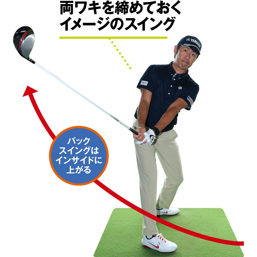 両ワキを締めておくイメージが強いスイングです。そのためバックスイングはクラブがインサイドに上がり、トップでクラブヘッドが軽くループを描いてダウンスイングはアウトサイド気味に振り下ろしています。