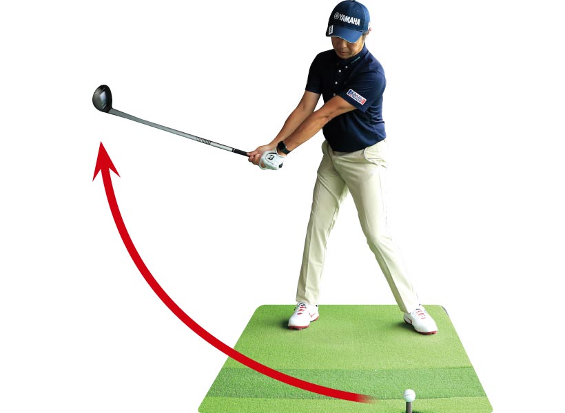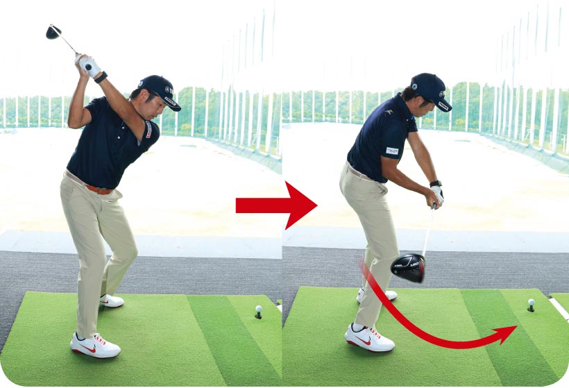 アウトサイドから下ろすと通常はカット軌道になりやすいのですが、田中瑞希選手の場合はインサイド方向に上げておいて、ダウンスイングでは腰の回転主導でクラブを少し立ててくるという感じ。そのためほぼストレートな軌道でボールをとらえています。「インサイド・ストレート」の表現がぴったりのスイングだと思います。