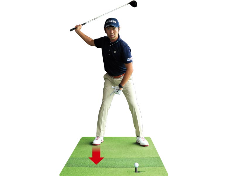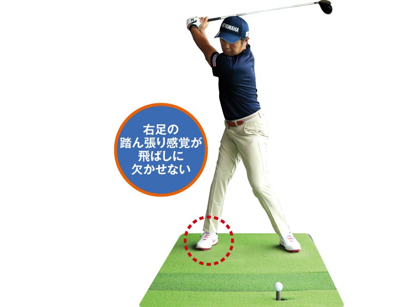 その特長がよく表われているのがバックスイング中の右足の踏ん張り。右足の内側でゴムティを踏んでいるとすれば、ゴムティを思い切り踏むようにして右足の内側に圧力をかけて上体を捻転させています。右足の内側でしっかり踏ん張れば右ヒザは多少右に動いても構いません。このように深い捻転を作っておけば飛ばしのパワーが存分に蓄えられて、ダウンスイング以降でターゲット方向にパワーをぶつけるイメージでヘッドを走らせることができるのです。