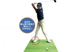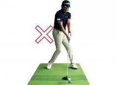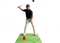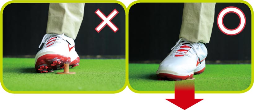 右足の外側に重心が乗ってしまうと右足の内側がめくれて、右ヒザや腰がスエーしてダウンスイングで体を正しく戻せなくなってしまいます。