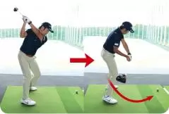 特徴的なのはテークバックの始動とインパクトの左足の蹴り上げです。テークバックはクラブヘッドよりもグリップ側が先に動かしだしています。クラブヘッドから動かそうとすると手打ちになりやすいのですが、笹生選手は体の回転を先行させることでグリップが先に動き、そこからシャフトをしならせてトップへと勢いよく上げているのです。切り返しでも体の回転が先行し、自然と大きなタメが作られています。