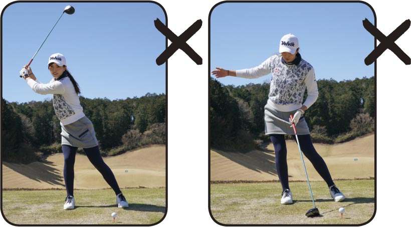 アドレスで注意して欲しいのはヘッドの位置です。ワイドスタンスにしたときでも、ヘッドの位置は体のセンターにしてください。ワイドスタンスにしたときにヘッドを左にあるボールに合わせると右肩が前に出て、少し被った構えになってしまいます。その結果、チーピンやヒッカケが出やすくなります。