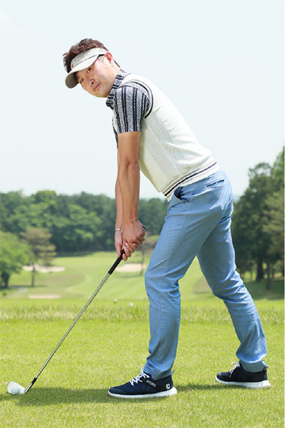 そこで体を素早く左に回転しながら、左手でグリップを引っ張り下ろしましょう。左手単体ではなく、体の回転と連動した左手リードでクラブを下ろせば、クラブヘッドがインサイドから適正の角度で下りてきて、ボールをダウンブローに打ち抜けます。私はこの左手の動きを「引き込み動作」という表現で説明していますが、左手一本打ちドリルでこうした正しい左手リードの動きをマスターしてください。