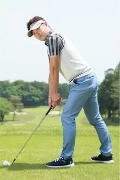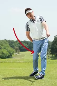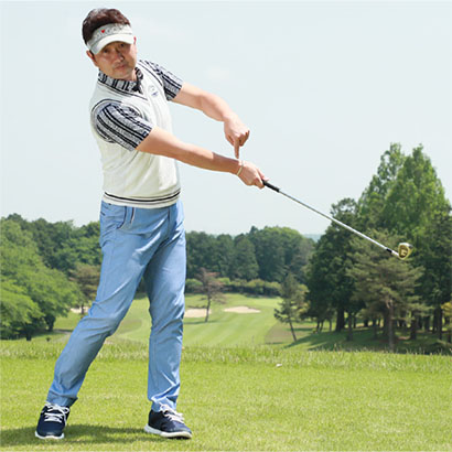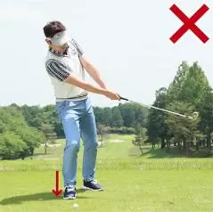 右足体重のままでバックスイングし、そのままクラブを振り下ろしてボールをヒットしたら、インパクト以降は体を左側に預けてターンさせましょう。実際のスイングで体重が右足に残ってすくい打ちになる人は、この体を左側に預ける動きができません。
