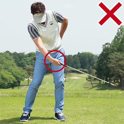 ダウンスイングからフォロースルーにかけて体の回転で遠心力が働くと、フォロースルーではクラブヘッドが体からどんどん離れていこうとします。クラブヘッドが目標よりも右側のアウトサイド方向に進もうとするわけです。ところがクラブの遠心力に任せっぱなしでは左ワキが大きくあいてしまい、回転がその時点で止まってクラブをフィニッシュのポジションへと導けなくなります。