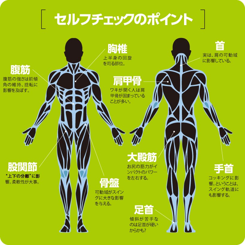 目澤 はい。それを見つけることが、上達の近道で、そこが私たちインストラクターの役目でもあります。ただ、自分のミスの原因が技術的なことばかりではなく、カラダの個性によることも多い。その部分は自分でもある程度はチェックできるんです。逆に言えば、それを知らないまま技術的な部分を改善しようとすると、目的を間違えた練習になりがちです。それでは本末転倒。かえって下手を固めるし、最悪、カラダを痛めてしまうことにもつながります。