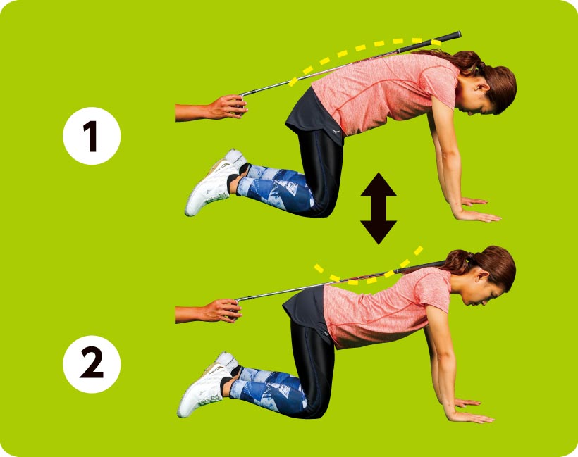 ②息を吐きながら、背骨を下げるイメージで腰を反らせる。1と2の反復動作を10回くらい繰り返す。
