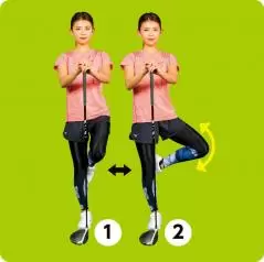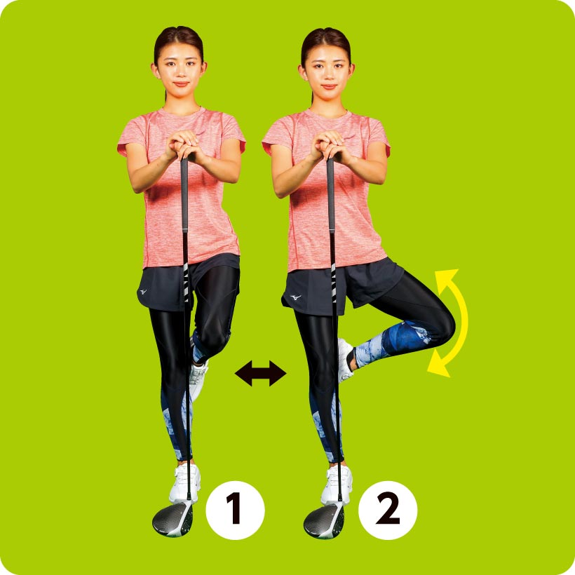 ①クラブでカラダを支え、片足のヒザを曲げて上げる。