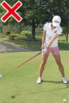 そして左手が右腰くらいの高さに上がったポジションでいったんストップ。この位置で左手の親指がグリップの真上に乗っているかをチェックしてください。ここで左手の親指がグリップの真上から外れてしまうと、トップでも左手親指の上にクラブが乗らなくなり、ダウンスイングの軌道がブレやすいんです。