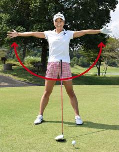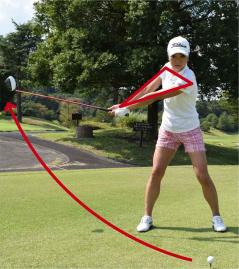 クラブヘッドとカラダの引き合いで大きな円弧を描くのがコツ