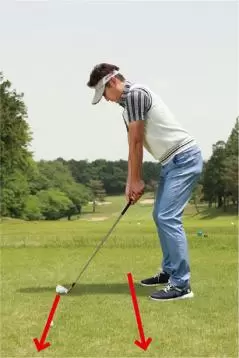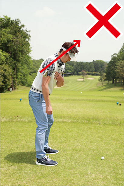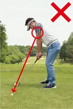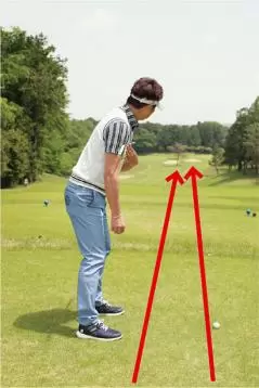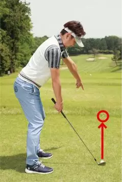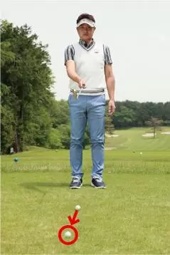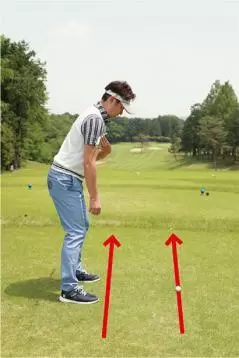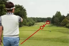 アドレスしたときのボールと自分のカラダの間隔の分だけ目標の左を向いて構えるべきなのに、カラダが開いているように感じやすいから、どうしても左肩を遠くの目標に向けてしまいがちです。そうするとスタンスと肩の向きが一致しないチグハグな構えとなり、様々なミスショットを引き起こしやすいのです。フェアウェイ右サイドがOBのホールではOBを避けようとしてカラダが左を向くこともありますが、これもまたミスの原因となります。