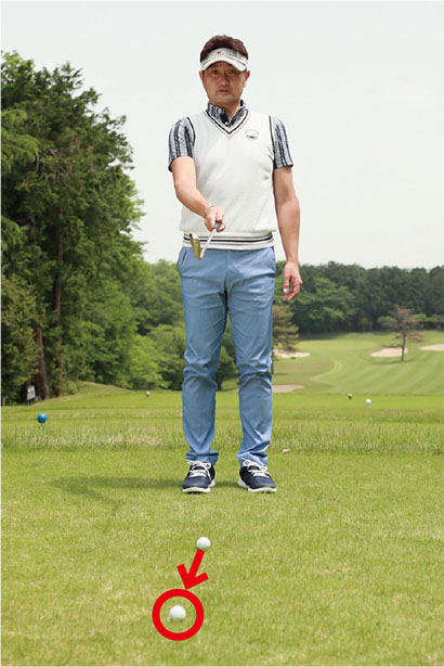 スクエアに構えるにはどうすればいいかというと、アドレスを作るルーティンワークを大事にすることです。アイアンでもドライバーでも、まずボールの真後ろから目標方向を見てターゲットラインを明確にイメージしましょう。そしてボールの50ヤードくらい先にボールを通過させたいポジションを決めます。これはボールの出球を安定させるための指標となります。写真でいえば前方のティーイングエリア上に見える白いティマーカーです。