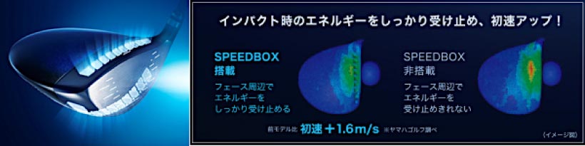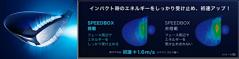 フェース面から約10mmのクラウン・ソール部に設けた深さ1.5mmのボックス状のへこみ「SPEEDBOX」が、フェース周辺の剛性を高めてエネルギーロスの原因となるヘッド後方への振動拡散を極限まで低減し、インパクトエネルギーを効率よくボールに伝え初速アップによる“ぶっ飛び”を実現した。