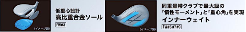 フェアウェイウッド・ユーティリティにも、フェース周辺の剛性を高める新構造「SPEEDBOX」を全番手に搭載。さらにフェアウェイウッド(#3)は、これまでのフェース一体型ボディから、新たに精密鋳造チタンボディと高強度なチタン圧延偏肉フェースとの組み合わせを採用したことで、たわみが増加し、初速アップに貢献している。