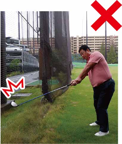 といってもいきなり壁に向かってのフルスイングは恐怖心があります。飛球線に沿ってひもを貼ったり、キャディバッグを置いたりする方法もありますが、ちょうどいいのはゴルフ場ならどこにでもある生け垣を利用した練習です。生け垣ならヘッドが木の葉に多少触れても大丈夫なのでフルスイングでも怖くありません。