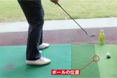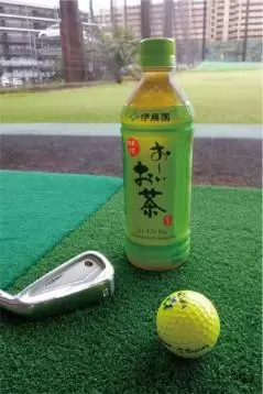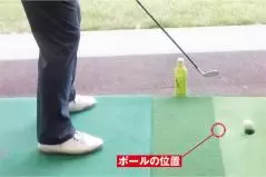 球を打ちながらプレーンを修正するときは目印にペットボトルを使います。クラブが短いとヘッド軌道の円弧が小さく難しいので5番くらいがオススメ。練習の合間に水分補給もできます。