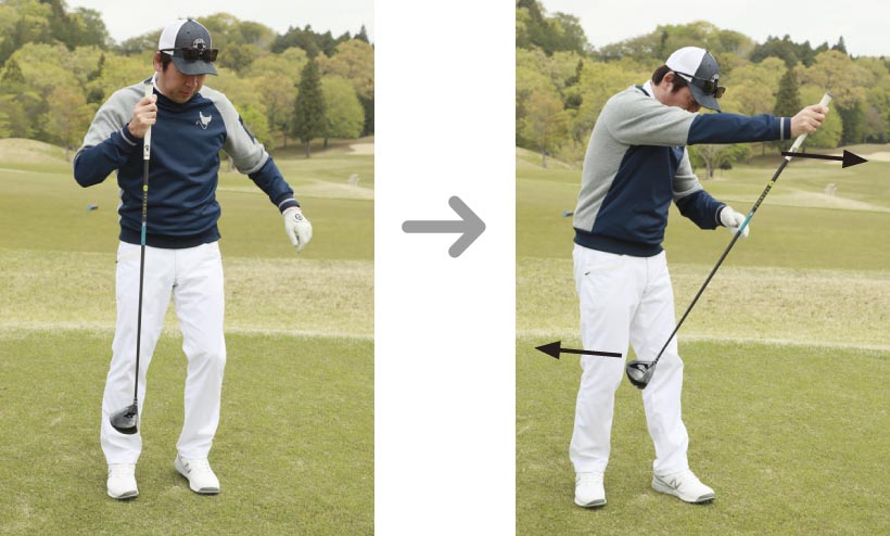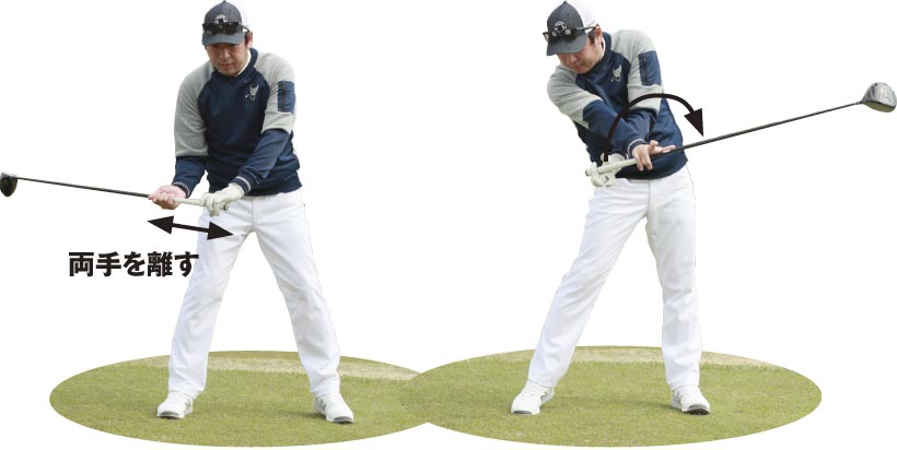 飛距離アップのポイントは、フェースが開閉するというクラブ本来の特性を生かして、ボールをつかまえること。そして、フォローでクラブとカラダが引っ張り合うように動いて、ヘッドを加速させることです。腕を振るのではなく、“ネジる”ように使うことで、それが行いやすくなります。「スプリットハンドドリル」で、腕のネジりとフェースが閉じる感覚を養いましょう。