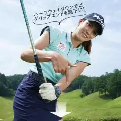 皆さん、ダウンスイングでは手首を斜めに動かしていませんか?それはNG!手首は真下方向に動かしてください。グリップエンドを地面に向けながらヘッドを下ろすのが正しい軌道です。
